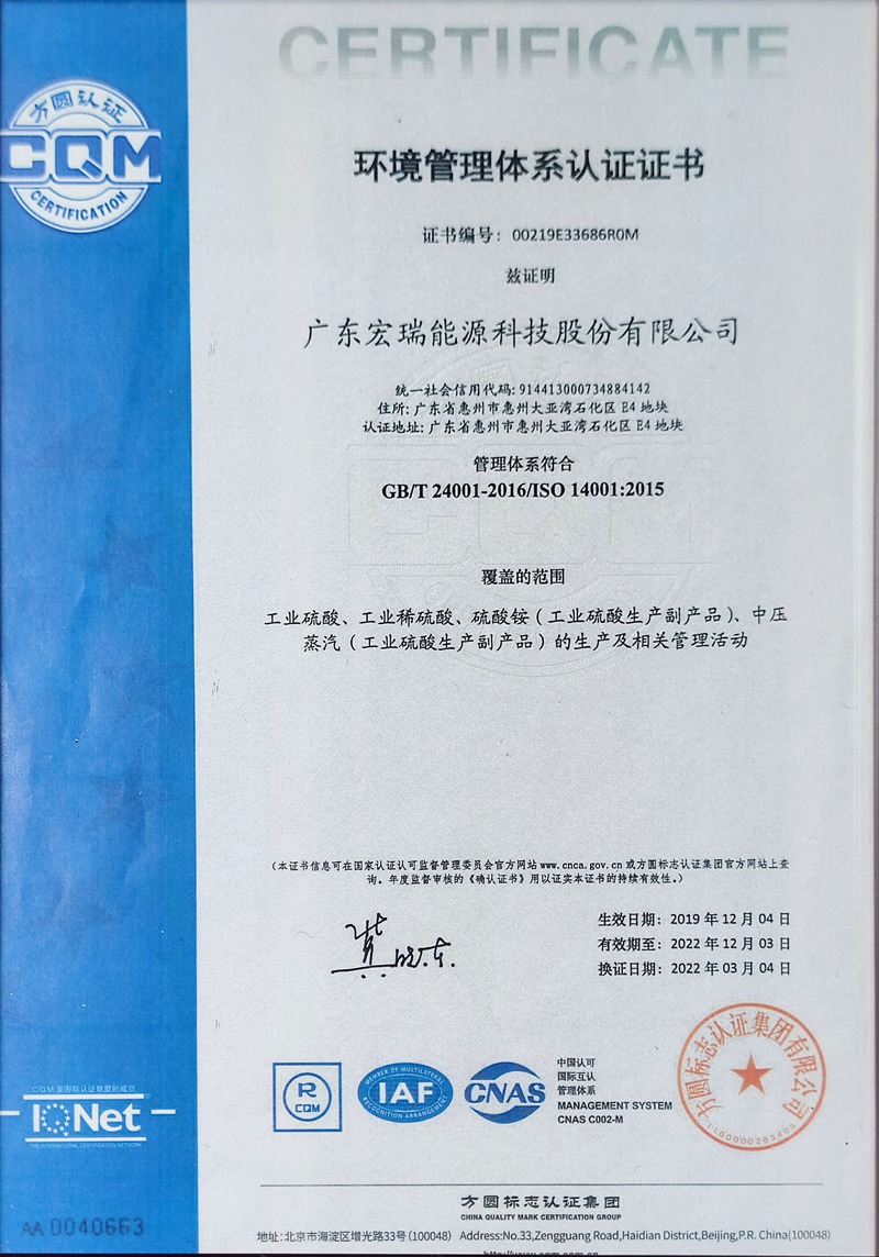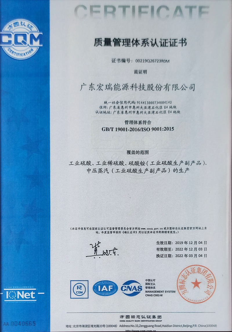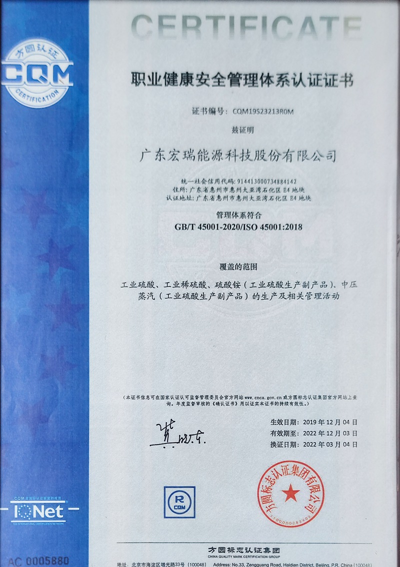 宏瑞股份建成了目前世界上已投產(chǎn)的規(guī)模最大的濕法制酸裝置,目前產(chǎn)能為硫酸約33萬(wàn)噸/年。該裝置采取“隔墻供應(yīng)”的合作模式,以中海油惠州石化大亞灣煉油廠產(chǎn)生的酸性原料氣為原材料生產(chǎn)硫酸(含蓄電池硫酸、試劑硫酸、工業(yè)硫酸等),通過(guò)一系列放熱反應(yīng)所產(chǎn)生的蒸汽作為石油煉化生產(chǎn)期間的重要能源供給,通過(guò)管道輸送給中海油惠州石化,實(shí)現(xiàn)了從煉油所產(chǎn)生含硫的酸性原料氣直接轉(zhuǎn)化為綠色低碳環(huán)保能源(中壓蒸汽),達(dá)到資源的綜合利用目標(biāo),大幅度減少二氧化碳排放總量(減少二氧化碳排放約26.52萬(wàn)噸/年),同時(shí)取得了良好的經(jīng)濟(jì)和社會(huì)效益。